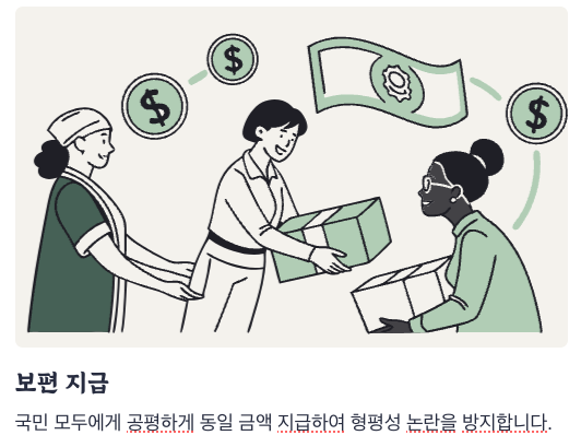 - 보편지급: 국민 모두에게 공평하게 동일 금액 지급 → 형평성 논란 방지