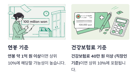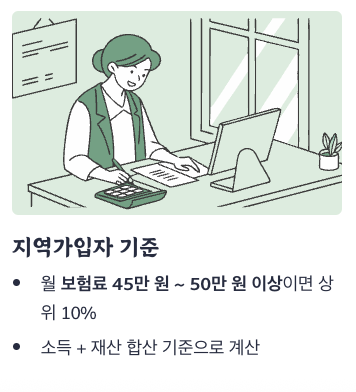 - 월 건강보험료 40만 원 이상일 경우 상위 10% 포함 가능성